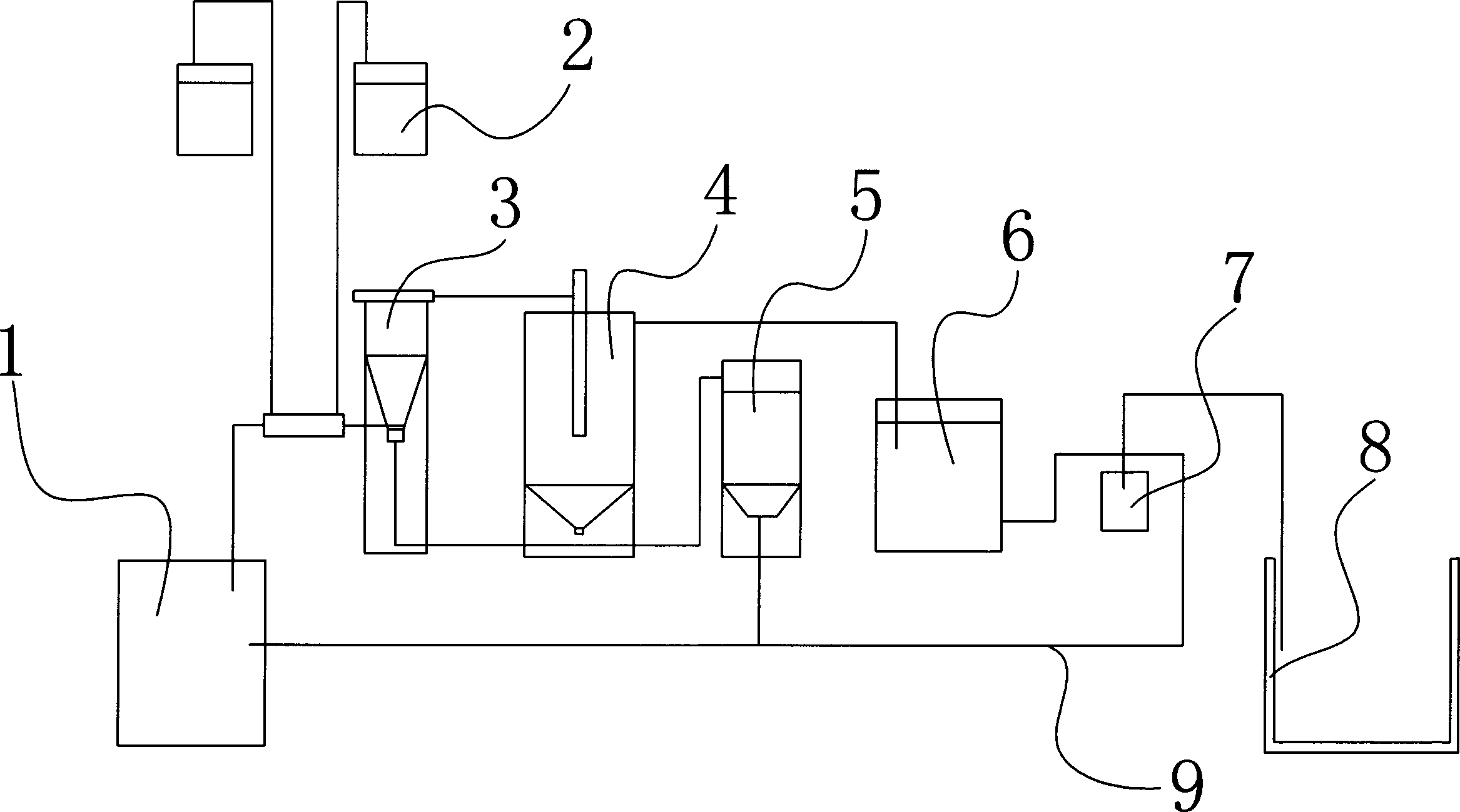 本實用新型解決其技術問題所采用的技術方案是:一種新型印刷廢水 處理系統,其特征在于:系統包含集水池、加藥系統、混合反應罐、沉淀罐、 集渣罐、中間水池、過濾器、清水池、回廢管,集水池與混合反應罐連接,集 水池和混合反應罐中間設置有加藥系統,混合反應罐與沉淀罐連接,沉淀罐底 部與集渣罐連接,沉淀罐頂端與中間水池連接,中間水池與過濾器連接,過濾 器與清水池連接,集渣罐底部通過回廢管與集水池連接。