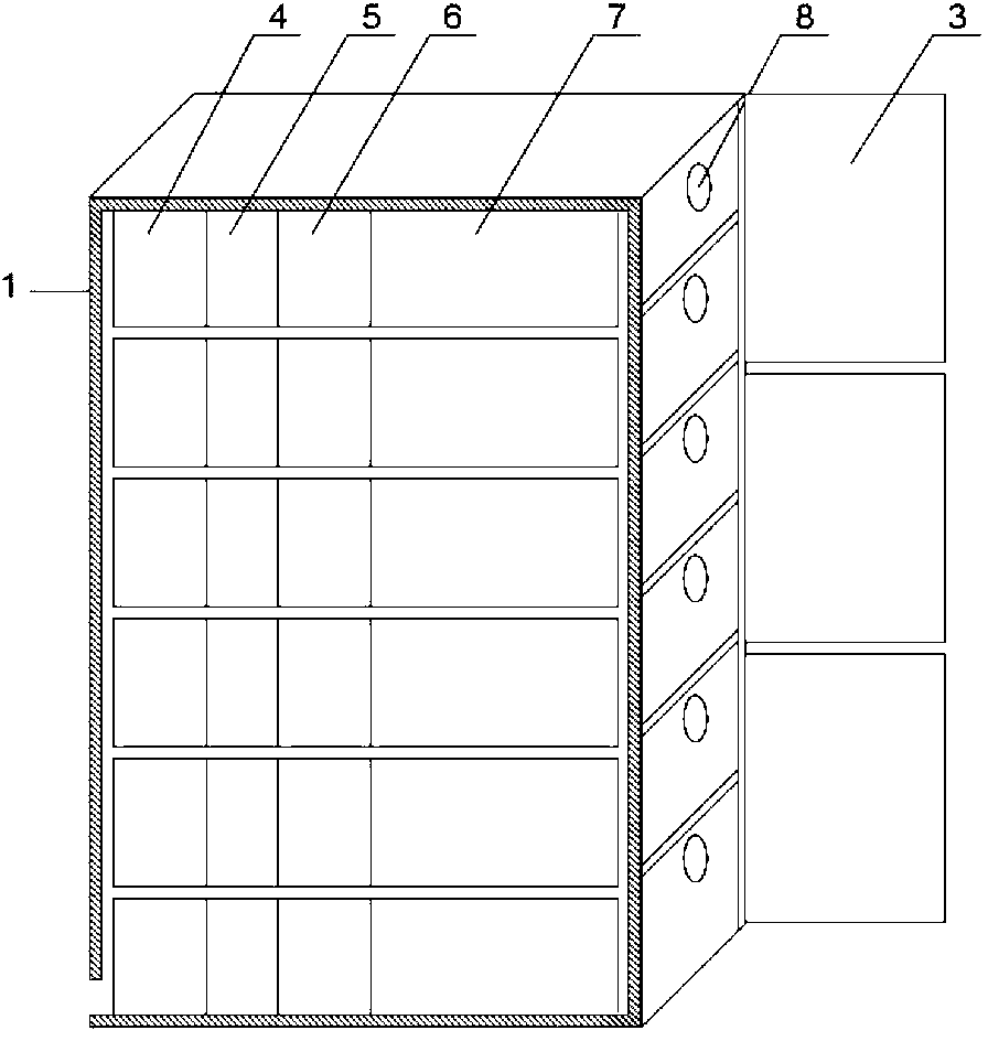 更進一步地,殼體通過分隔架分為4-8層,污水桶、石灰層、細泥層和細沙層安裝在分隔架上;殼體在靠近污水桶的一側設有門。