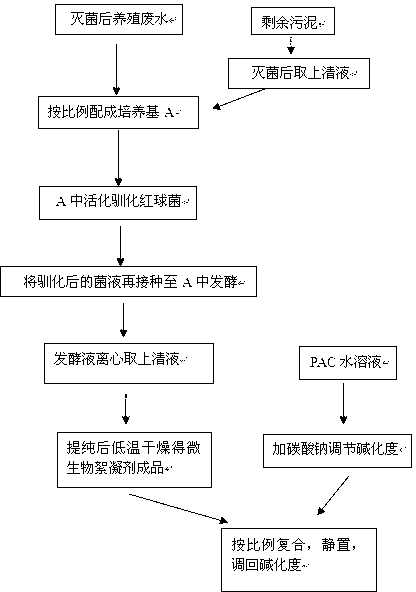 本發明涉及一種由生物絮凝劑(MBF-R)和聚合氯化鋁(PAC)復合而成的復合絮凝劑的制備方法,具體包括:將剩余污泥和養殖廢水分別在高溫滅菌,然后取滅菌后污泥上清液和養殖廢水按比例混合成培養基A,將紅平紅球菌接種至培養基A中活化馴化,馴化后,菌液接種至一個新的培養基A于發酵培養;直接將離心后的發酵液上清液與調好堿化度的PAC按體積比1:(6-11)的比例混合。本發明方法避免了傳統培養基高成本的不足,產品在酸性pH下也能有較好的絮凝效果,降低了PAC的投加量至少30%,降低了廢水絮凝處理的成本。