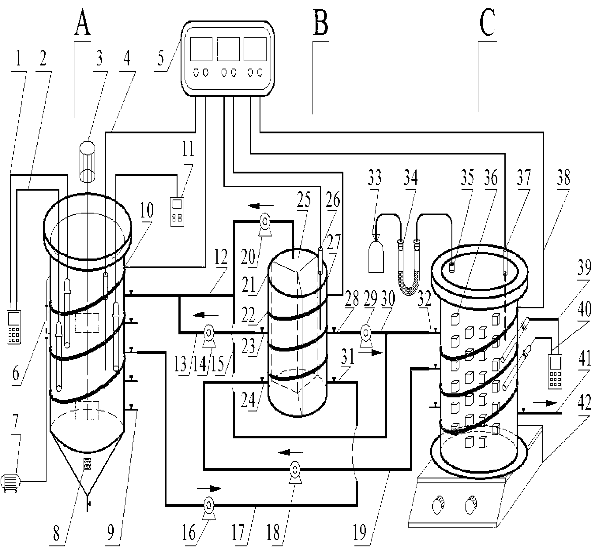 SBBRANAMMOXC至上而下設有第二取樣閥32,內部填充有海綿填料36,配有第 二ORP儀39、第二pH儀40;反應器頂部設有排氣口35,經過干燥管34與 集氣袋33相連;內設置有第三溫度傳感器37,外圍第三控溫加熱帶38 ,與溫控箱5相連,底部設置有磁力攪拌儀42;