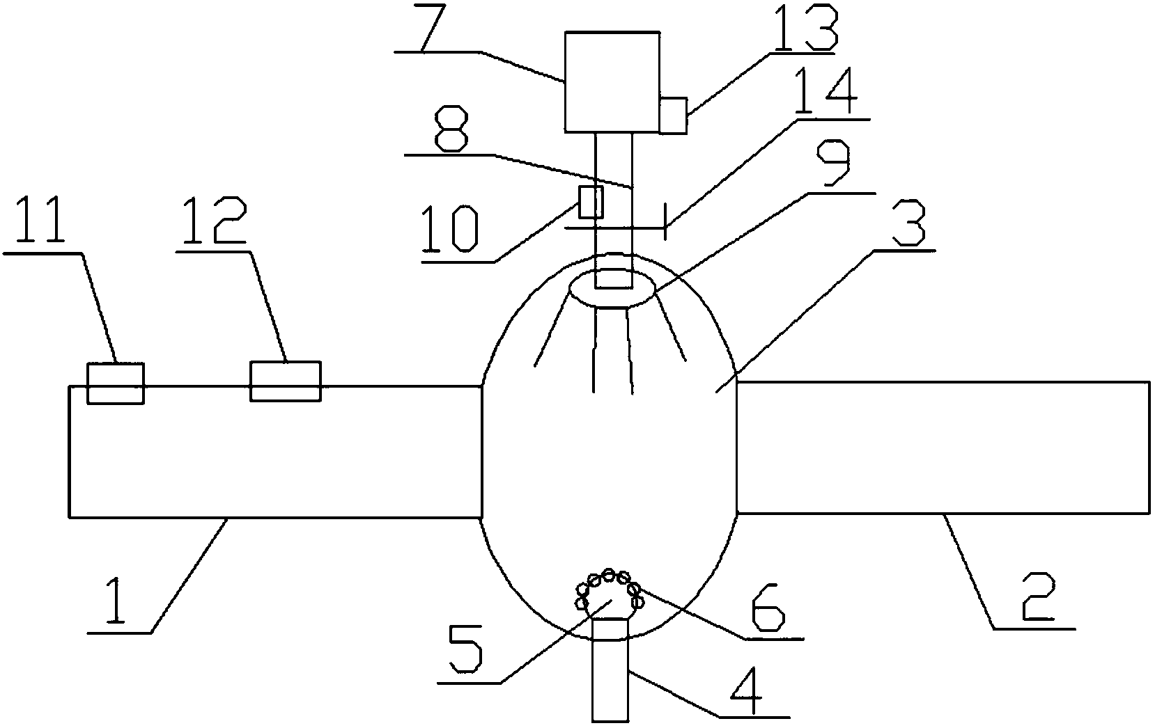 所述藥物反應(yīng)池(3)的容積為原水進(jìn)水管(1)中每分鐘內(nèi)最大流量的2倍;所述藥物反應(yīng)池(3)傾斜設(shè)置在原水進(jìn)水管(1)和原水出水管(2)兩者之間;球體的頂部高度與原水進(jìn)水管底部?jī)?nèi)壁的高度相等;