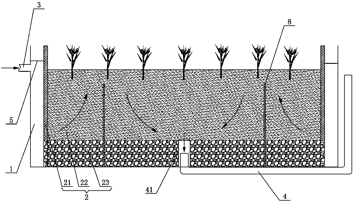 目前,應對人工濕地堵塞的主要措施有采取間歇進水,定期更換填料的物理方法,添加化學融菌劑或微生物抑制劑的化學方法等,這些措施存在實用性不強或二次污染的問題。傳統的人工濕地采用長寬比不大于3m的矩形設計,由一端進水,另一端出水。相同的水力負荷下,進水區域有機負荷較大,這也是進水區域較易堵塞的原因;隨著濕地系統對污水中有機物的去除,有機負荷水流方向逐漸減低,不利于濕地系統中植物及微生物的生長和污染物質的去處。