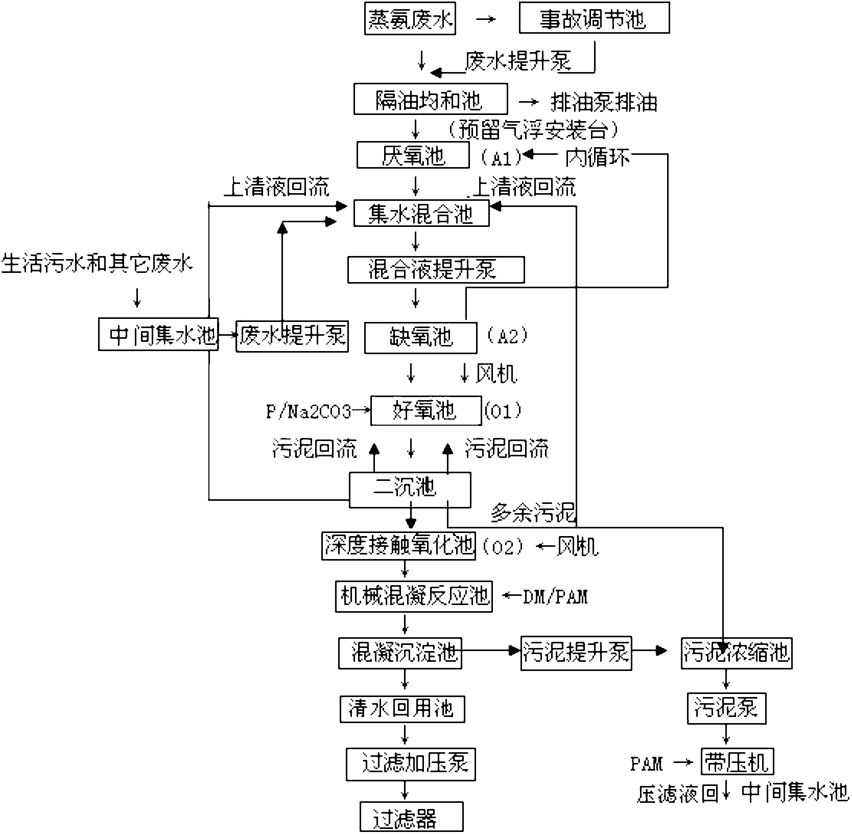 1)污水預(yù)處理:蒸氨廢水進(jìn)入隔油池,隔油池包括隔油區(qū)和水質(zhì)均和區(qū); 在隔油區(qū),重油沉淀在下部的集油斗內(nèi),依靠排油泵定期排出;在水質(zhì)均和區(qū), 廢水逆向流上升通過(guò)集水堰收集后進(jìn)入?yún)捬醭?