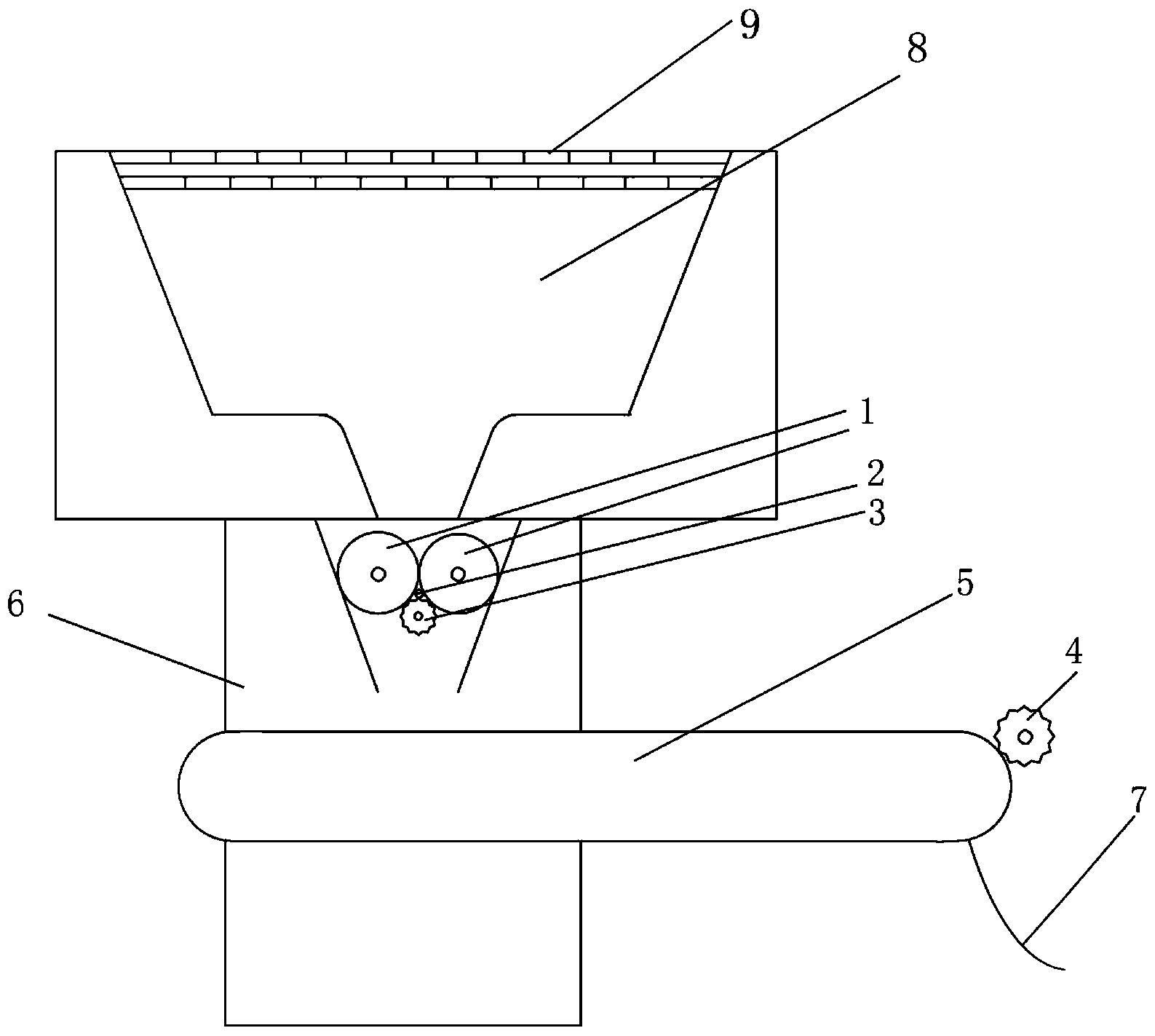 本發明中的設備方案是這樣實現的:一種污泥細化設備,其用于對污泥進行細壓處理,其特征在于:包括集料倉,所述集料倉底部設有多組輥筒,所述集料倉頂部設有雙層過濾網,所述雙層過濾網上層孔徑大于下層孔徑;所述輥筒底部設有傳送帶,所傳送帶頂部的設有用于擠壓污泥成片狀的污泥輥壓筒