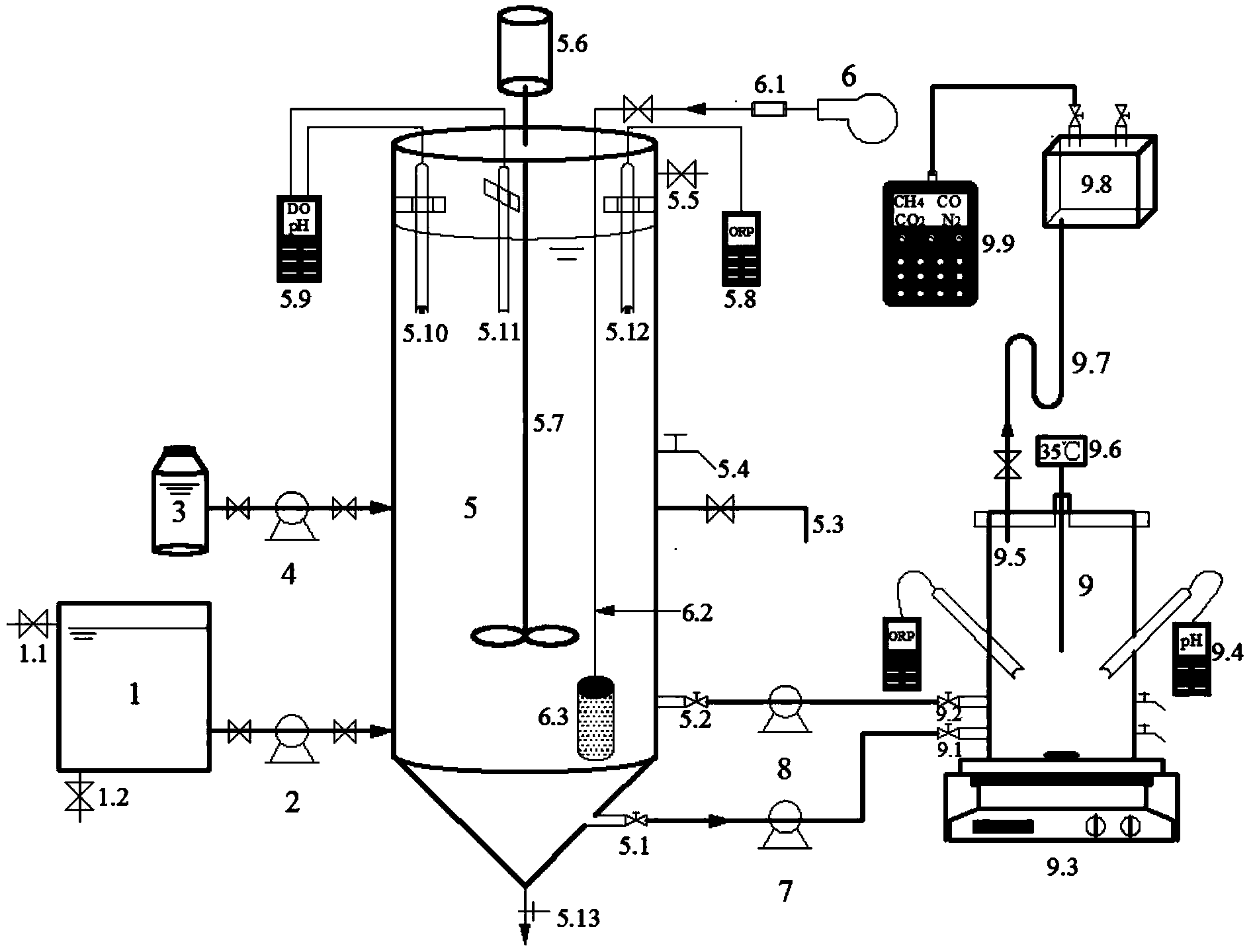一種基于污泥厭氧發酵強化生物脫氮及污泥減量的裝置,其特征在于:設有城市生 活污水原水水箱(1)、進水泵(2)、加藥箱(3)、加藥泵(4))、脫氮反應器(5)、空壓 機(6)、排泥泵(7)、污泥回流泵(8)、污泥厭氧發酵反應器(9)。所述原水水箱(1) 為一開口箱體,設有溢流管(1.1)和放空管(1.2),并通過進水泵(2)與脫氮反應器的 進水口相連;所述加藥箱(3)通過加藥泵(4)與脫氮反應器加藥口相連;所述脫氮反 應器(5)為SBR反應器,反應器中部設有攪拌器(5.6)和攪拌漿(5.7),反應器器壁 上設有五種閥門,分別是排泥閥(5.1)、污泥回流閥(5.2)、出水管(5.3)、取樣口(5.4)、 溢流閥(5.5)。此外,反應器中插有pH電極(5.10)和溶解氧探頭(5.11)、ORP電極 (5.12),電極分別連接ORP測定儀(5.8)和WTW3420水質分析多參數測定儀(5.9), 反應器底部設有放空管(5.13);脫氮反應器曝氣系統包括空壓機(6)、氣體流量計(6.1)、 氣體擴散管(6.2)、砂芯曝氣頭(6.3);所述污泥發酵反應器(9)為一密閉反應器,設 有密封蓋,密封蓋上設有氣體收集管(9.5),通過U型管(9.7)連接氣體收集盒(9.8), 并連接便攜式氣體分析儀(9.9)監測反應器氣體產量。反應器采用加熱磁力攪拌器(9.3) 進行加熱及攪拌,通過溫度傳感器(9.6)監測控制溫度。此外,反應器器壁插有pH電 極和ORP電極,pH計(9.4)和ORP測定儀連接相應的電極。反應器器壁設有進泥閥 (9.1)、排泥閥(9.2)和兩個取樣口兼加藥口。