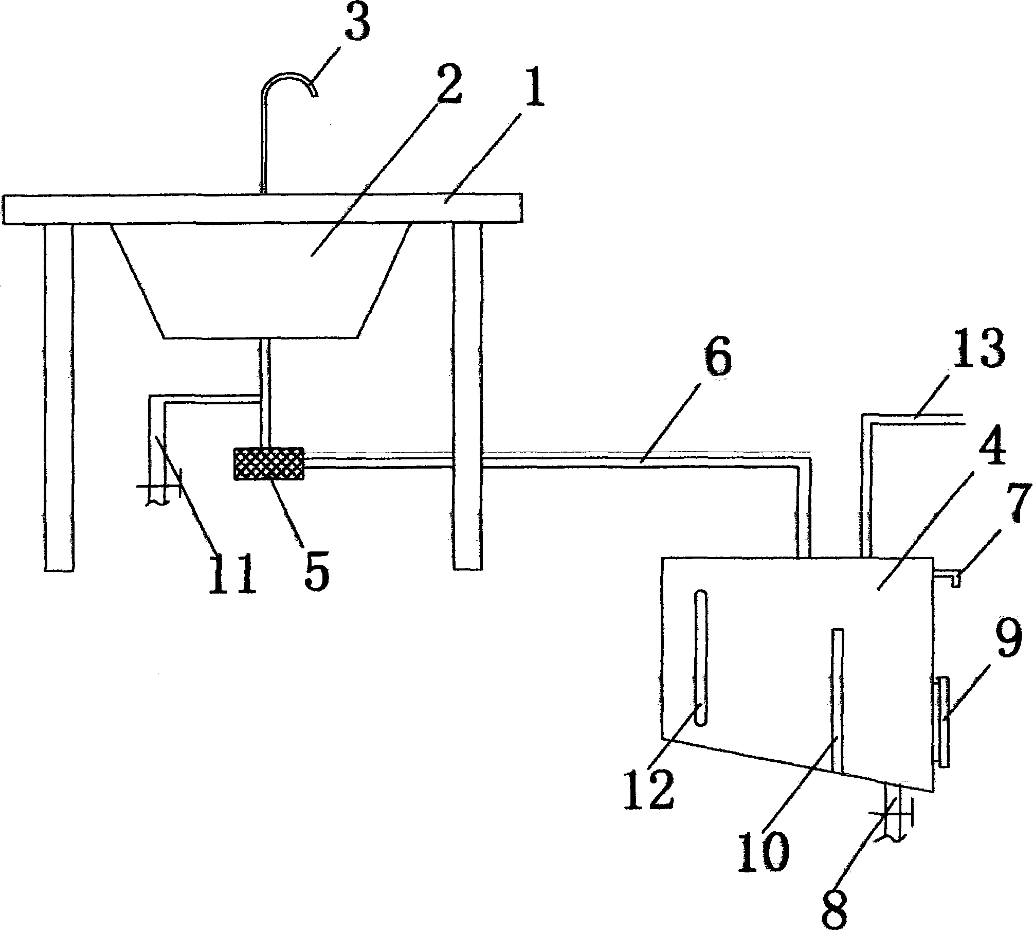 為實現上述目的,本實用新型采取的技術方案為:一種新型廢水回用設備,其包括水池臺、水池、水龍頭、蓄水箱以及過濾 器;其中,所述水池嵌設在水池臺上;所述水龍頭安裝于水池臺 上,并位于水池上方;所述水池和蓄水箱通過一排水管連接;所 述過濾器安裝于排水管上;所述蓄水箱的上部設有一溢水管,底 部呈傾斜設置;于所述蓄水箱的底部設有一出水管,側部設有一 清淤口;于所述蓄水箱內設有一隔板;所述排水管、蓄水箱的連 接處與出水管、蓄水箱的連接處位于隔板的不同側。