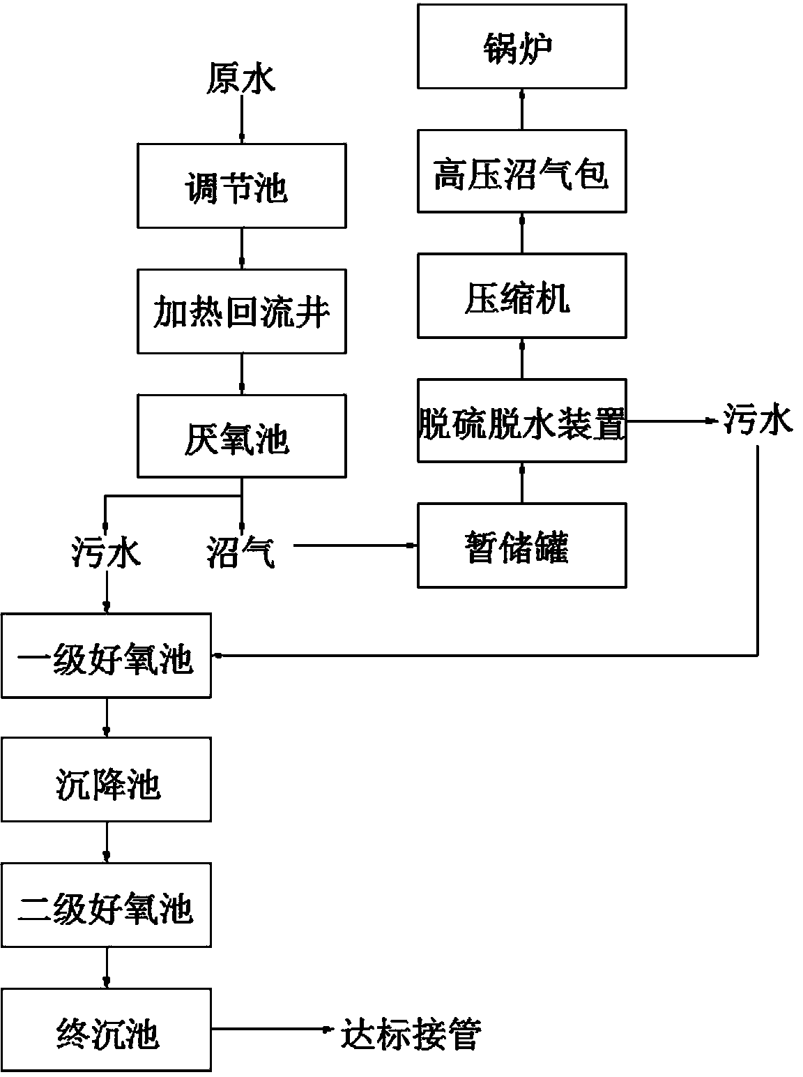 為了解決背景技術所存在的問題,本發明是采用以下技術方案:利用淀粉廢水生產沼氣的系統,按照廢水處理的先后順序,所述污水依次經過調節池、加熱回流井、厭氧池,在所述厭氧池中發酵分離出沼氣和污水,所述沼氣進入暫存罐暫存,進一步進入脫硫脫水裝置進行處理,經脫硫脫水后的所述沼氣再進入壓縮機壓縮成高壓沼氣,儲存在高壓沼氣包中,最后進入鍋爐燃燒系統;所述污水依次流入一級好氧池、沉降池、二級好氧池、終沉池中進行處理,最后達標的水通過所述終沉池上的接管流出,所述脫硫脫水裝置中產生的污水也流入一級好氧池、沉降池、二級好氧池、終沉池中進行處理。