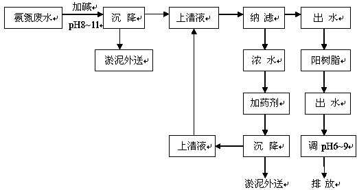 本發(fā)明的技術(shù)特點(diǎn)在于,首先將氨氮廢水調(diào)到pH>8,沉淀一段時(shí)間,等上清液無(wú)懸浮顆粒時(shí)將上清液進(jìn)納濾裝置,然后將納濾出水進(jìn)陽(yáng)離子交換樹(shù)脂進(jìn)行氨氮吸附,出水氨氮低于7mg/L,顯酸性,用堿調(diào)pH=6~9即可排放。
