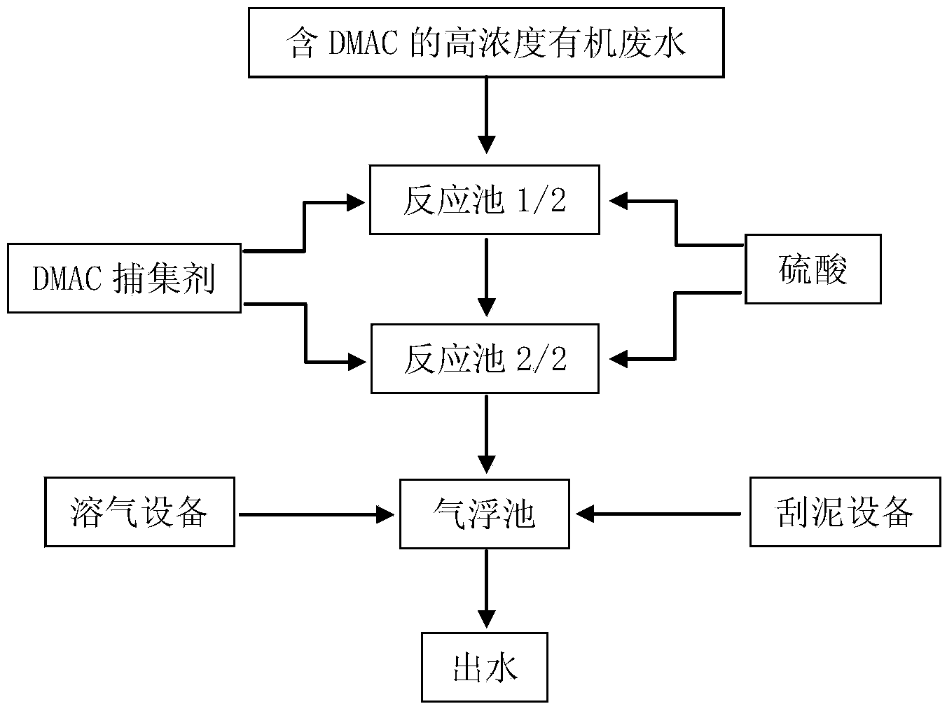 含DMAC的高濃度有機廢水預處理方法,所述步驟為:含有機物COD和高濃度DMAC 及其它有機氮廢水進入反應池,向反應池內投加DMAC捕集劑和酸,所述的DMAC捕集劑 由亞硝酸鈉組成,在反應池內停留時間為10—50分鐘,PH值為1--2,隨后進入氣浮池, 停留時間10—20分鐘,清水進入下道處理單元,氣浮池浮渣通過刮泥設備去除。尤其是 經過二道反應池投加DMAC捕集劑和酸,所述的酸是30%硫酸。