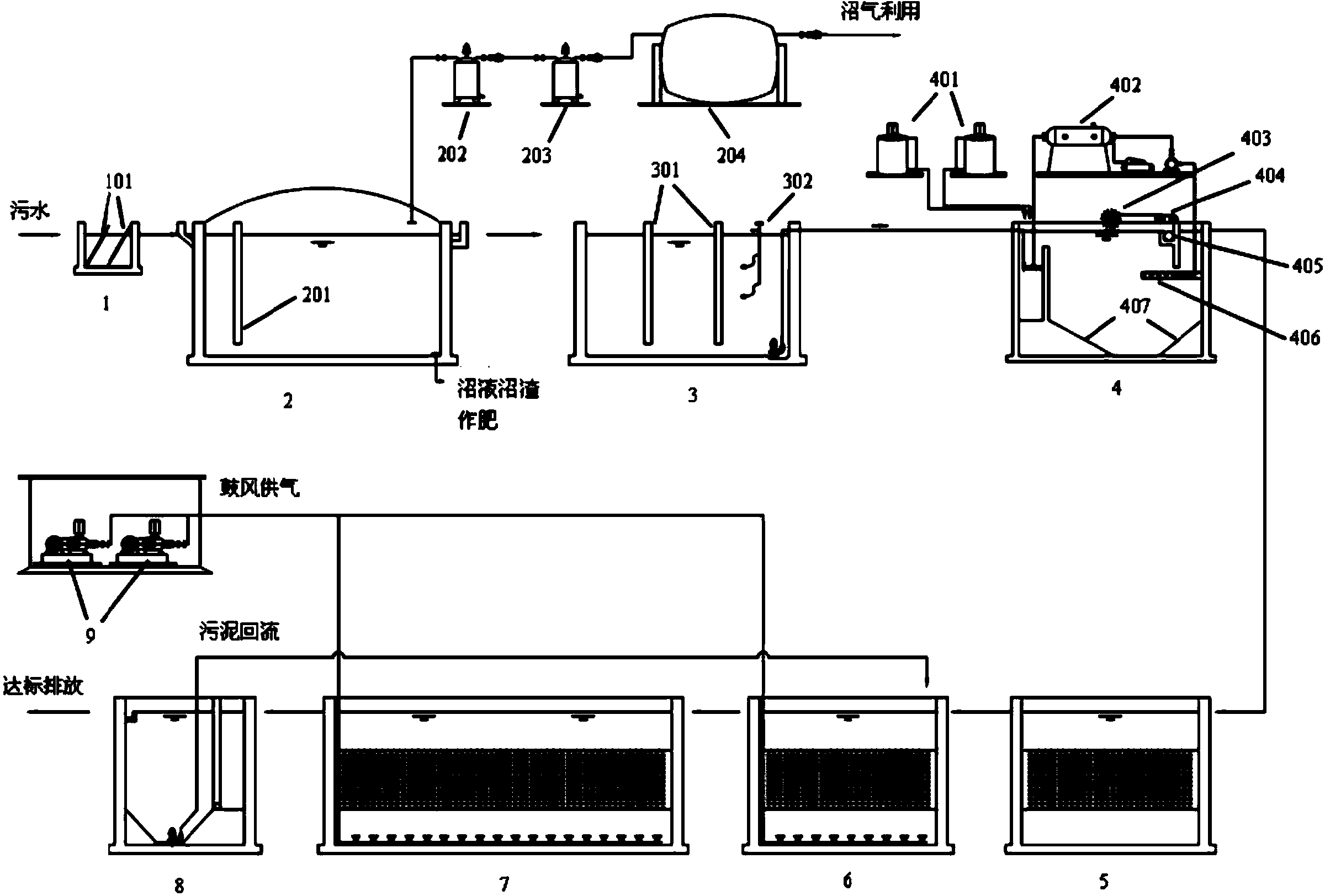 其中,從格柵渠、厭氧發(fā)酵池、隔油調節(jié)池、復合式懸浮物雙向分離系 統(tǒng)、水解酸化池、缺氧池、生物接觸氧化池到沉淀池逐級連通,所述缺氧池 和所述生物接觸氧化池分別通入鼓風機風口;所述沉淀池底部設置有污泥回 流泵,所述污泥回流泵出口分別連通所述水解酸化池、所述缺氧池和所述厭 氧發(fā)酵池中,沉淀池上部設置有排水出口。