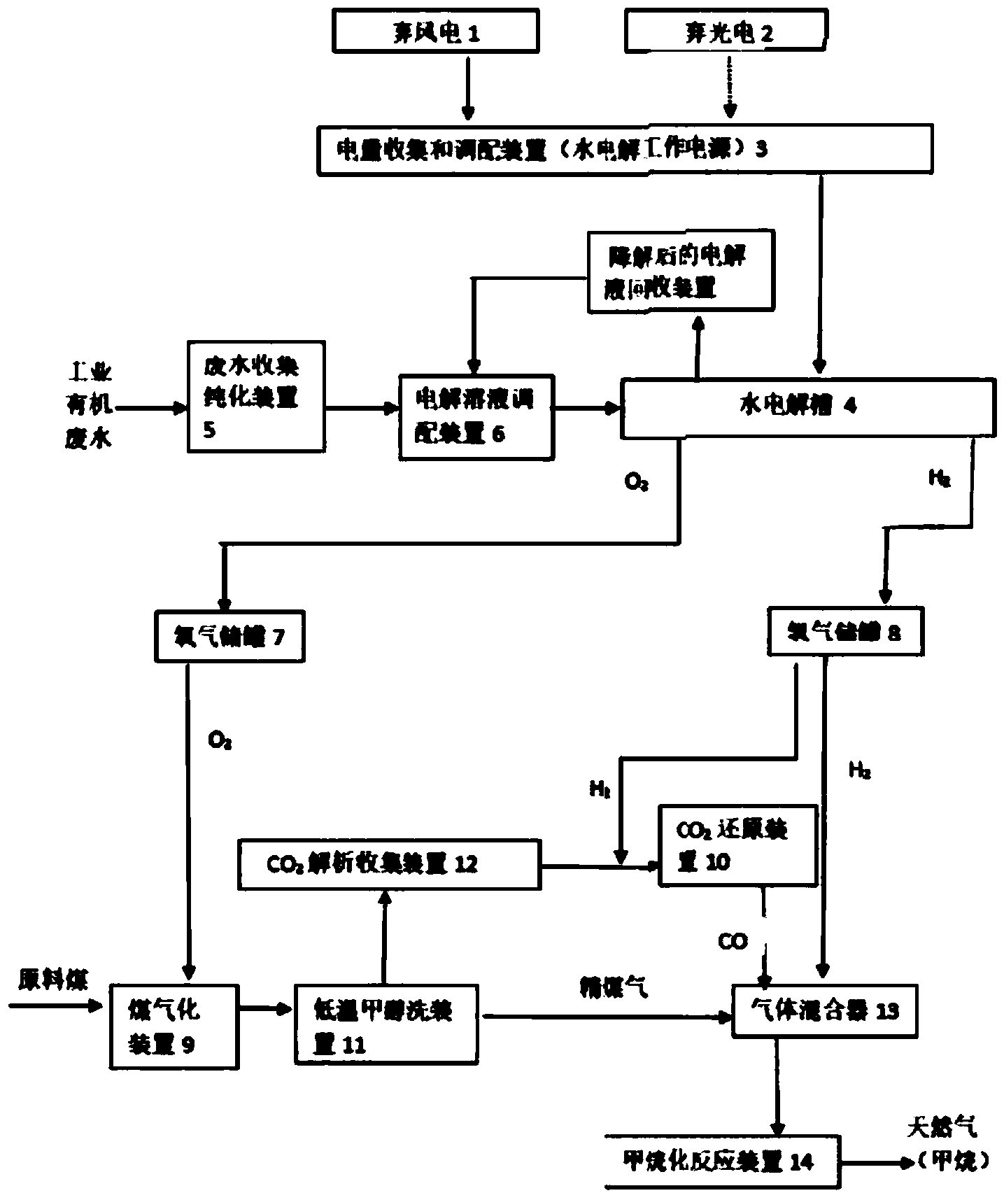 風、光棄電和工業有機廢水用于煤制天然氣的系統,包括收集棄風電1和 棄光電2的電量收集和調配裝置3,和電量收集和調配裝置3連接的水電解槽4, 廢水收集純化裝置5通過電解溶液調配裝置6連接水電解槽4,水電解槽4的陽 極連接氧氣儲罐7,陰極連接氫氣儲罐8,氧氣儲罐7的出口依次連接煤氣化裝 置9、低溫甲醇洗裝置11和氣體混合器13,氣體混合器13的入口和氫氣儲罐8 的出口連接,在低溫甲醇洗裝置11與氣體混合器13間依次連接有二氧化碳解 析收集裝置12和二氧化碳還原裝置10,二氧化碳還原裝置10的入口還與氫氣 儲罐8的出口連接,氣體混合器13的出口連接甲烷化反應裝置14。