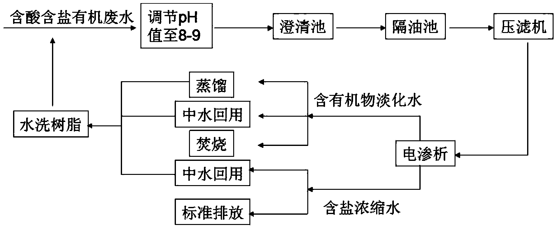 所述中水回用是指將處理后的廢水作為工藝水使用,繼續投入相同的反應過程中,而后產生含酸含鹽有機廢水,如此,實現了廢水的循環利用。