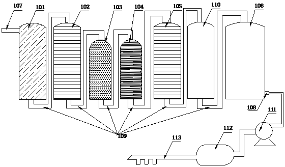 1.一種香水用純凈水處理及自動輸送裝置,其特征在于,包括通過管道(109)依次連接的石英砂過濾器(101),活性炭過濾器(102),保安過濾器(103),反滲透過濾裝置(104),二次石英砂過濾器(105),混合床(110)以及蓄水罐(106),前一級組件的底端設有出口與后一級組件的頂端設有的入口相連,所述活性炭過濾器的側壁上設置有原水進水口(107),所述蓄水罐(106)的側壁下端設置有純凈水出水口(108),純凈水出水口(108)以下依次連接純水泵(111),紫外線殺菌器(112)以及設置有多個出水口的出水管道(113)。