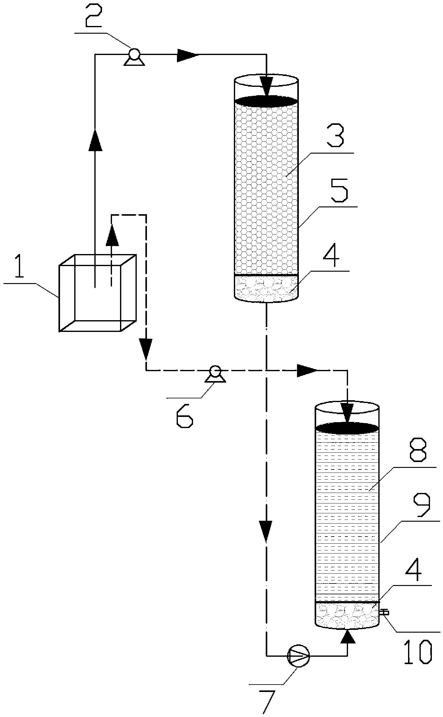 本實用新型的原理:采用酸中和殘渣和和脫水鋁污泥作為復合濾池濾料,利用基質固體 表面的吸附和離子交換,以及濾料中的脫氮功能菌去除污水中的氨氮和總氮,同時通過在兩 級濾池之間增加二次布水和適當延長停留時間的方式改變工藝條件。總體上,此系統結合兩 種濾料的結構和功能特點,配以適當的運行條件達到對含氮污水的高效去除。