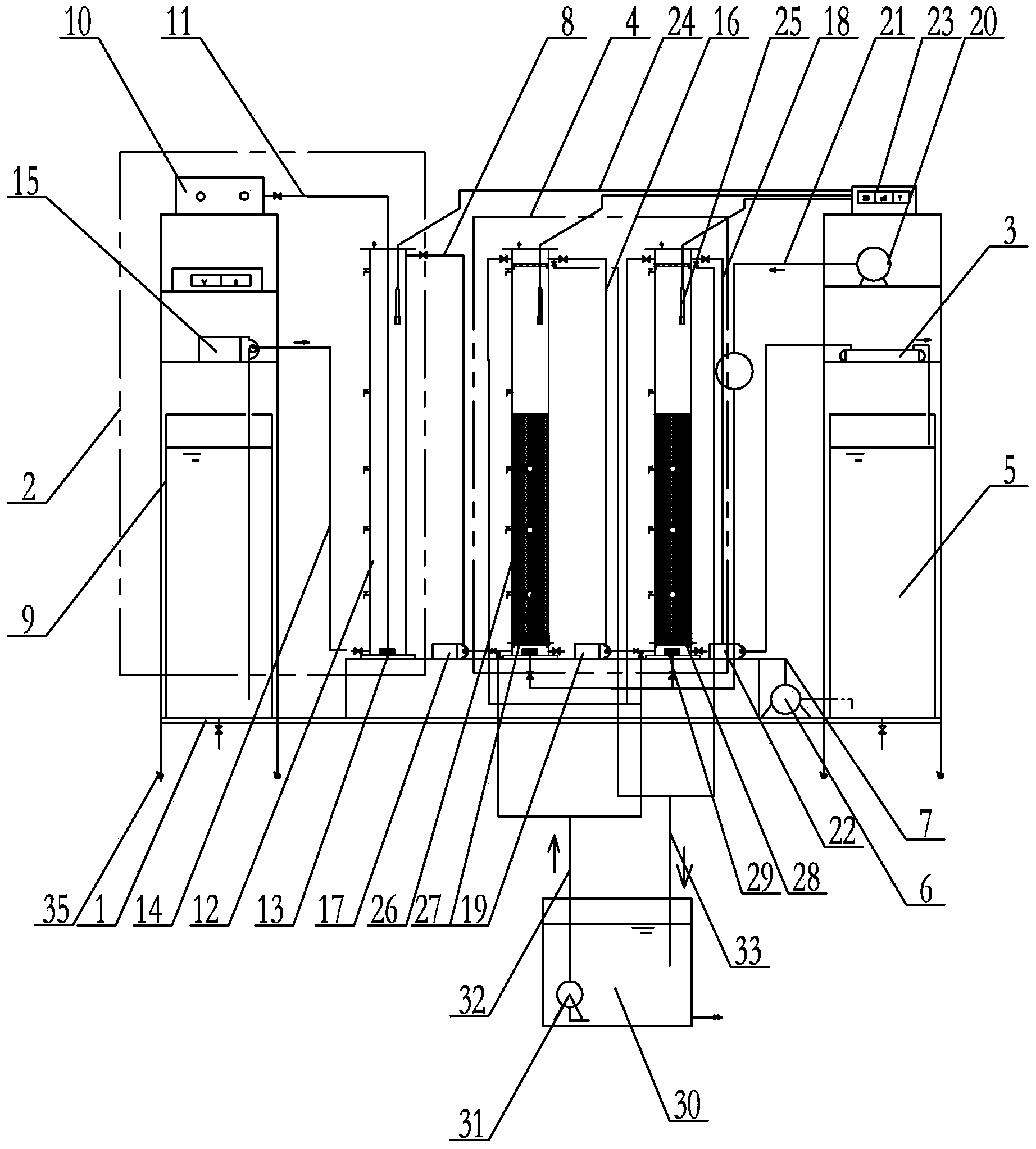臭氧氧化、兩級(jí)生物增強(qiáng)活性炭、紫外消毒水處理裝置,它涉及一種水處理裝置。本發(fā)明為了解決現(xiàn)有的水處理裝置中無法實(shí)現(xiàn)運(yùn)行模式多樣化,小規(guī)模運(yùn)行試驗(yàn)和實(shí)時(shí)數(shù)據(jù)在線監(jiān)測(cè)的問題。本發(fā)明的臭氧氧化水處理裝置(2)和紫外消毒器(3)設(shè)置在一體化試驗(yàn)裝置固定架(1)的左右兩側(cè),兩級(jí)生物增強(qiáng)活性炭(4)和反沖洗水箱(5)由左至右依次設(shè)置在臭氧氧化水處理裝置(2)的右側(cè),兩級(jí)生物增強(qiáng)活性炭(4)和反沖洗水箱(5)之間通過反沖洗水管(7)連接,反沖洗水泵(6)設(shè)置在反沖洗水管(7)上,紫外消毒器(3)設(shè)置在反沖洗水箱(5)的上部。本發(fā)明用于水處理。