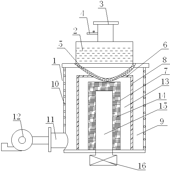 1.改進的污泥處理設備,包括殼體,其特征在于:所述殼體頂部設有污水處理箱,所述污水處理箱頂部設有污泥入口,所述污泥入口端設有進水管,所述污水處理箱底部設有過濾網,所述過濾網底部置于殼體內的過濾桶處,所述過濾桶由內筒和外筒構成,所述過濾桶口外壁與殼體內壁形成熱空氣流道,所述殼體內壁設有多根加熱管,所述殼體底部設有空氣進口,所述空氣進口與熱空氣流道連通。