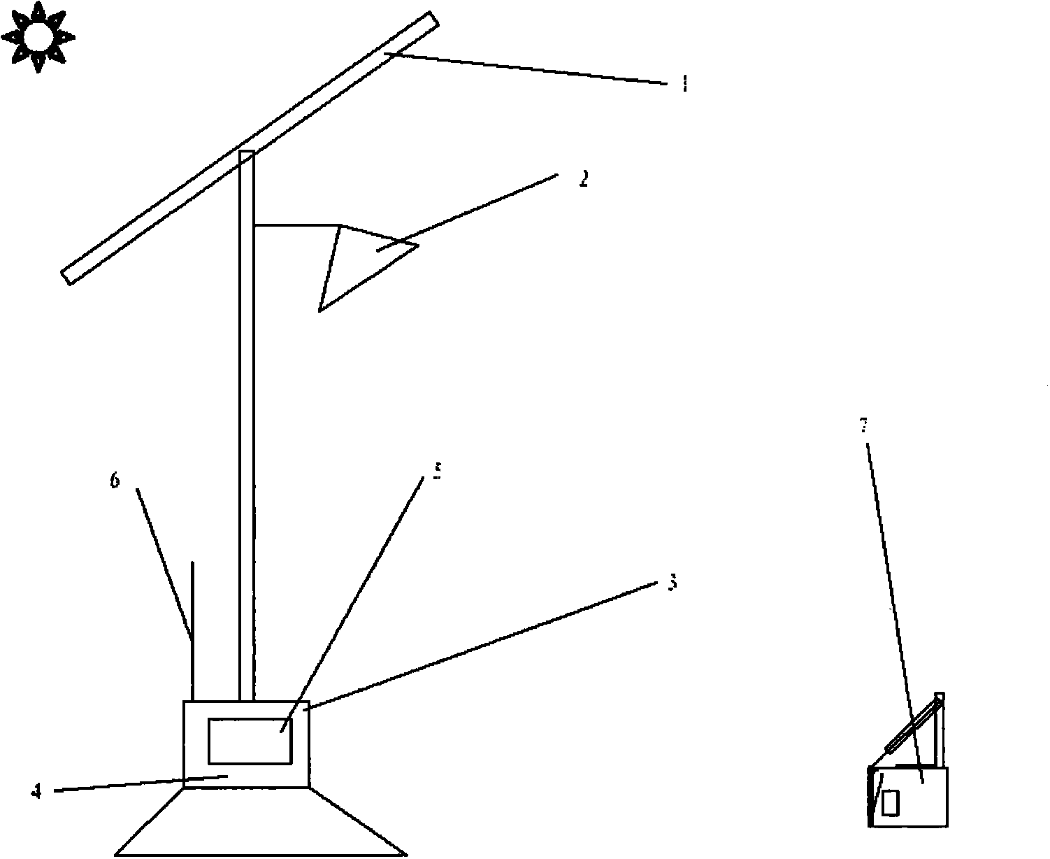 該殺菌裝置由支架、太陽能光伏電池板、LED紫外燈、蓄電池、控制單元、紫外線輻射傳 感器及防護罩組成,其中支架的頂端安裝有太陽能光伏電池板,下端安裝有控制單元及蓄電 池,其中控制單元包括遙控接收模塊及數字顯示器,支架的上端安裝有與蓄電池連接的LED 紫外線燈,紫外線輻射傳感器安裝于地面附近,其外側罩有防護罩,防護罩的前側設有防護 快門,防護快門通過連桿與直線電機相連,防護罩的頂面安裝有雨滴檢測傳感器;