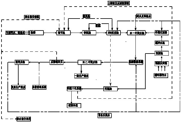 優選地,所述的連續微濾系統連接第二中間水池,經連續微濾系統過濾后的水導入第二中間水池中進行沉淀后能得到生產回用水。