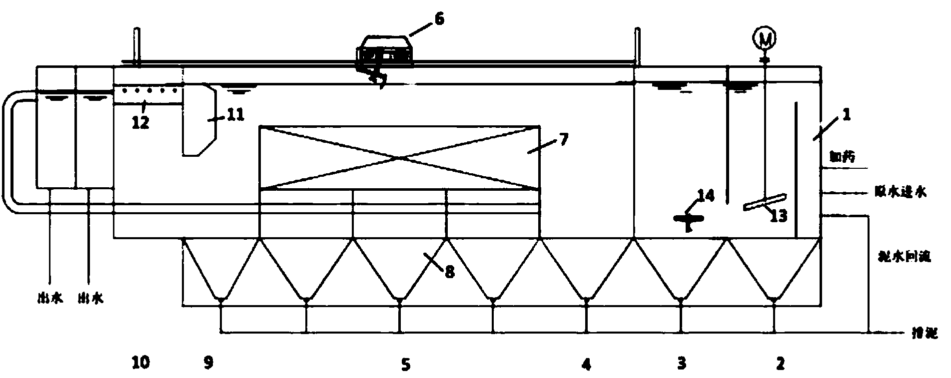 4.根據權利要求1所述的一種低溫低濁水處理裝置,其特征在于:所述混凝反應區(2) 內設置有混合攪拌槽,槽內設置混合攪拌機(13)。