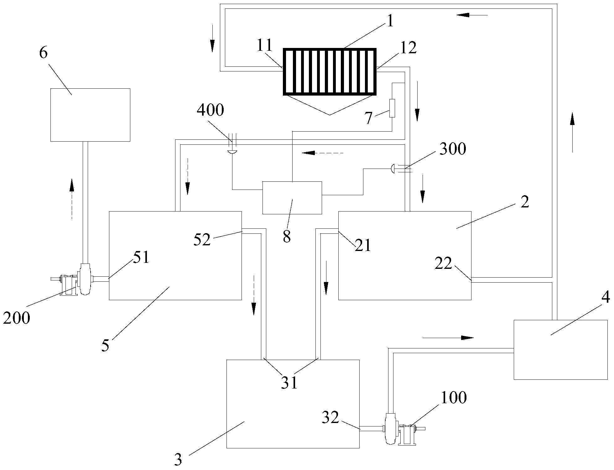 在工業生產中,為了節約水資源,并且減少廢水排放量,需要將廢 水處理回收利用。如在洗煤過程中,需要耗費大量的水,同時產生大量 的泥煤水,這些泥煤水都會通過相應地處理系統循環利用。目前常采用 板框壓濾機作為脫水設備。如圖1所示。現有技術中回收利用板框壓濾 機的濾液水的方法主要是先將洗煤產生的泥煤水輸入板框壓濾機1′,經 過板框壓濾機1′過濾后,將濾液水排入一個沉淀池2′進行沉降澄清,再 將沉淀澄清的濾液水傳入循環池3′中,通過循環水泵100′供向外部的洗 煤系統4′使用,如脫泥水、脫介水或清掃水使用。外部洗煤系統4′洗煤 后產生的煤泥水經過洗煤系統分級后,產生的細顆粒煤泥水傳入板框壓 濾機1′進水端,再一次進行過濾回收利用,從而實現洗煤水的循環利用。