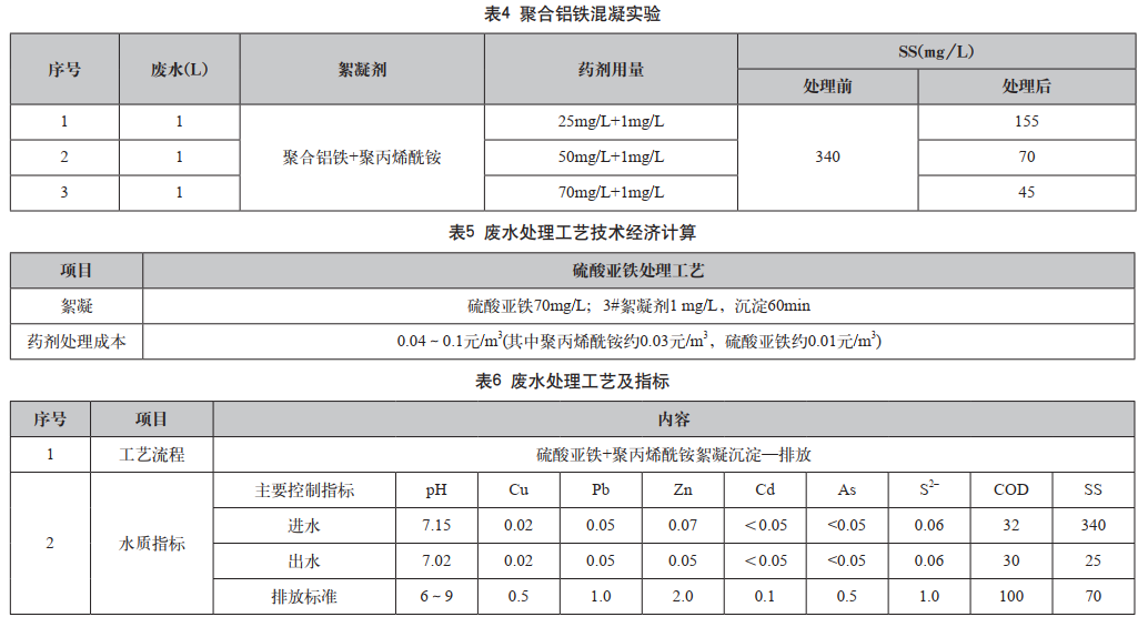 從水質(zhì)分析情況來看,選礦總廢水中除了固體懸浮物超標(biāo)外,其他離子含量均符合排放標(biāo)準(zhǔn)。解決選礦廢水外排的關(guān)鍵是降低廢水中的固體懸浮物,在處理方法和流程配置上,兼顧流程結(jié)構(gòu)簡(jiǎn)單、操作方便、運(yùn)行費(fèi)用較低等。目前,國(guó)內(nèi)外處理含重金屬?gòu)U水的方法主要有化學(xué)沉淀法、氣浮法、離子交換法、吸附法、混凝法、生物法等,其中,混凝法與其他方法相比,具有流程結(jié)構(gòu)簡(jiǎn)單、操作方便、運(yùn)行費(fèi)用較低等優(yōu)點(diǎn)。本研究采用混凝沉淀工藝對(duì)選礦廢水進(jìn)行凈化處理,處理后的廢水無色、無刺激性氣味。