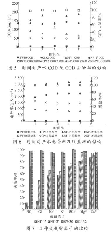 納濾和反滲透膜產水的COD和電導率,以及膜對COD和鹽的去除率如圖5、圖6所示,膜對離子的截留率見圖7所示。