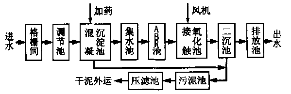 廢水經混凝沉淀預處理后,進入ABR以提高其可生化性,出水再經懸浮填料接觸氧化池和二沉池處理后達標排放。