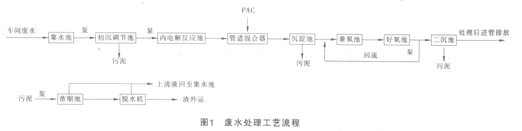 1、催化鐵內電解-混凝-生物膜法處理工藝流程: