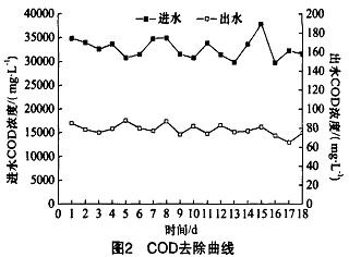 如圖2所示,廢水經過處理后,c0D被有效去除,出水水質達標。在第l5天時,進水c0D高達37,800m/L時,處理效果理氌,.說Ij}l該摩挺處理系統具有一定的抗沖擊負倚能力。