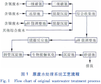東莞市明輝五金電鍍有限公司建于1996 年7月,主要從事塑膠電鍍、五金電鍍,生產(chǎn)廢水包括含鎳廢水(57.68 m3/d) 、含氰廢水(26.4 m3/d) 、含鉻廢水(12.64 m3/d) 、綜合廢水(203.28 m3/d) ,總廢水量為300 m3/d。公司已建有一套廢水處理系統(tǒng),采用分質(zhì)分流處理的方式,工藝流程如圖1 所示。該廢水處理系統(tǒng)的設(shè)計處理能力為300 m3/d,出水水質(zhì)執(zhí)行廣東省《水污染物排放限值》(DB 44/26—2001) 的一級標(biāo)準(zhǔn)。由于東莞市要求自2012 年12月起,所有的電鍍類企業(yè)執(zhí)行《電鍍污染物排放標(biāo)準(zhǔn)》(GB 21900-2008) 的表3 標(biāo)準(zhǔn),并且廣東省要求專業(yè)電鍍企業(yè)的工業(yè)用水循環(huán)回用率達(dá)到60%以上,因此該企業(yè)需對廢水處理系統(tǒng)進(jìn)行升級改造,一方面通過膜過濾系統(tǒng)保證處理出水回用率達(dá)到60%以上,另一方面通過高級氧化與生化組合工藝確保出水達(dá)標(biāo)排放。