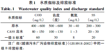 浙江省某印染制革園區污水處理廠進水中制革廢水約占50%,印染廢水約占40%,其他工業廢水約占10%,經“水解酸化+ CASS”處理后,出水COD 和色度仍未能達到《城鎮污水廠污染物排放標準》一級B排放標準要求,具體水質指標及排放要求如表1 所示。