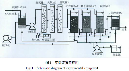 O3-BAF 中試裝置如圖1 所示。實驗用水CASS出水經潛水泵打入前端石英砂濾池1,去除SS 以減少進入臭氧柱內的懸浮物濃度。石英砂濾池出水經抽濾泵打入第1 根臭氧柱內,同時在第1 根臭氧柱內通入臭氧發生器(青島國林CF-G-3-30 型,采用氧氣源供氣)產生的臭氧,再依次通過第2、3 根臭氧柱確保臭氧與有機物充分接觸反應并去除多余臭氧。臭氧氧化出水分別以相同流量并聯流入活性炭BAF、混合填料BAF 以及陶粒BAF,濾池出水進入后端石英砂濾池2 去除BAF 運行過程中脫落的生物膜等懸浮物,保證出水SS 達到一級B 排放標準。臭氧反應柱和BAF 都采用向下流方式運行,氣水逆向。濾池反沖洗采用先氣沖后氣水聯合反沖方式,其中氣沖強度15 L/(m2·s),氣沖時間10 min,水沖強度10 L/(m2 · s ),氣水聯合反沖時間20 min。