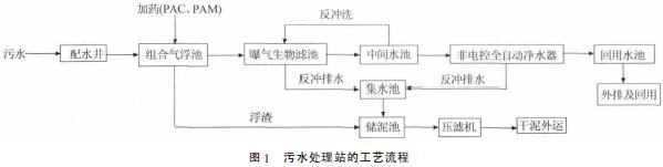 從圖1 可以看出,3 股廢水首先進(jìn)入配水井混合,再進(jìn)入氣浮預(yù)處理裝置進(jìn)行泥水分離,浮渣通過(guò)刮渣機(jī)刮入渣槽,自流進(jìn)入儲(chǔ)泥池,清水由提升泵送至BAF。BAF 由兩級(jí)串聯(lián)組成,每級(jí)分10 個(gè)池子,主要去除COD、SS 等;BAF 出水自流進(jìn)入中間水池。中間水池儲(chǔ)水部分供BAF 反沖洗用水,其余經(jīng)加壓送至全自動(dòng)凈水器進(jìn)行過(guò)濾。全自動(dòng)凈水器出水流入回用水池。回用水池分兩個(gè)區(qū),其中的綠化用水需加藥消毒。BAF 和全自動(dòng)凈水器的反沖洗出水自流進(jìn)入集水池,經(jīng)自然沉降,上清液送入配水井,底泥送入儲(chǔ)泥池。集水池分兩個(gè)區(qū),一區(qū)為污泥沉淀區(qū),二區(qū)為清水區(qū),兼具調(diào)節(jié)和沉淀雙重作用。儲(chǔ)泥池的污泥經(jīng)螺桿泵送至帶式壓濾機(jī)壓泥,泥餅外運(yùn)。
