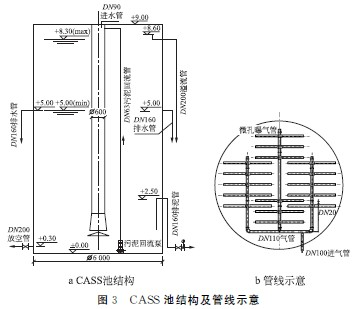 (3)CASS池。2座,鋼結構。單組尺寸¢6m×H9m,有效水深8.3m,每組有效容積234m3。中間設圓筒作為生物選擇區,生物選擇區尺寸為¢0.6m×H 8.2m。CASS池結構及管線見圖3。調節池出水由泵提升進入CASS池中央生物選擇區,在CASS池內曝氣一段時間后沉淀,再依次進行排水和排泥。CASS 池內污泥負荷為0.32kg-BOD5/(kgMLSS·d),污泥濃度4g/L,排水比30%(可調節范圍為25%~40%)。每組每天運行3個周期,采用連續進水的方式,一個周期為8h,具體為:進水、曝氣5h→進水、沉淀1.5h→進水、排水(泥)1.5h。每組新增微孔曝氣管45根,單根參數為D90mm×L1000mm;Q=12~15m3/h;污泥回流泵2臺(1用1備),單臺參數為:Q=10m3/h,H=10m,N=0.75kW。