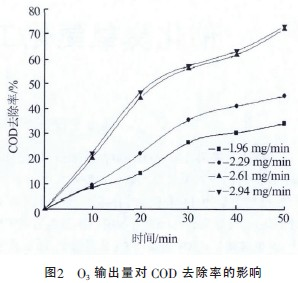 O3的輸出量對處理效果有重要影響。控制發(fā)生器使O3輸出量分別為1.96、2.29、2.61、2.94mg/min,催化劑的投加質(zhì)量為3.6g,不調(diào)節(jié)廢水pH,總反應(yīng)時間為50min,每隔10min取1 次樣,分別測定其COD,計(jì)算COD 的去除率,結(jié)果見圖2。