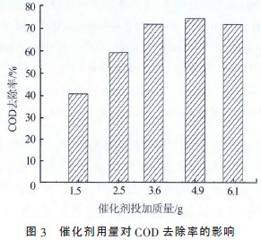 由圖3 可知,開始隨著催化劑用量的增加,COD的去除率逐漸增大,并在4.9g時達(dá)到最大,為74.87%,繼續(xù)增加催化劑的用量時,COD 的去除率反而減小。當(dāng)催化劑用量較少時,催化反應(yīng)的活性點(diǎn)較少,吸附臭氧和反應(yīng)物的量也少,致使處理效果不明顯;隨著催化劑用量的增加,催化反應(yīng)的活性點(diǎn)增多,吸附臭氧和反應(yīng)物的量也相應(yīng)增多,COD 的去除率逐漸增大,處理效果明顯;但隨著催化劑用量的繼續(xù)增大,催化劑顆粒越來越多,臭氧在廢水中的小氣泡間凝聚匯集,導(dǎo)致傳質(zhì)速率下降,影響了臭氧和反應(yīng)物的反應(yīng)速率,致使COD 的去除率減小,處理效果下降。因此本實(shí)驗(yàn)催化劑的合適投加質(zhì)量為4.9g。