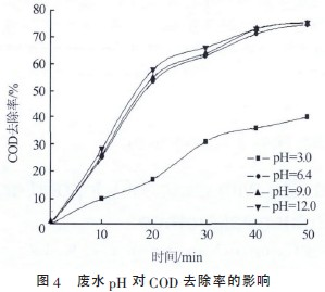 廢水pH 不同時,O3的氧化反應(yīng)機(jī)理也不同,對處理效果會產(chǎn)生影響。控制O3的輸出量為2.61mg/min,催化劑的投加質(zhì)量為4.9g,廢水初始pH 分別取3.0、6.4、9.0、12.0,總反應(yīng)時間為50min,每隔10min取1 次樣,分別測定其COD,并計(jì)算COD 的去除率,結(jié)果見圖4。