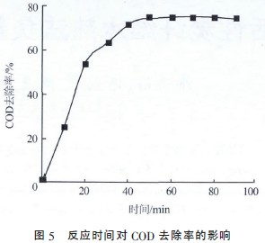反應(yīng)時間既影響處理效果,也影響實(shí)際運(yùn)行成本的高低。控制O3的輸出量為2.61mg/min,廢水初始pH=6.4,催化劑的投加質(zhì)量為4.9g,分別在反應(yīng)時間為10、20、30、40、50、60、70、80、90min時取樣,測定其COD,并計(jì)算COD 的去除率,結(jié)果見圖5。