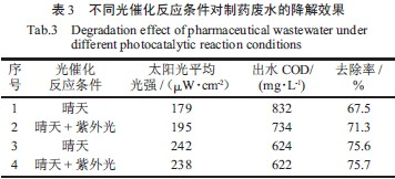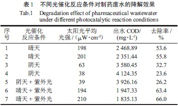 由表1 和圖1 分析可知,光源強度對制藥廢水COD 的去除效率影響很大,隨著太陽光強的增強,光催化對制藥廢水的降解效果也愈加突出,當太陽光強度一定時,開啟紫外燈,也會適當提高光催化反應對制藥廢水COD 去除率。