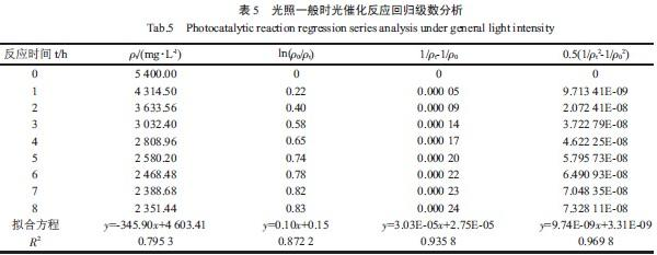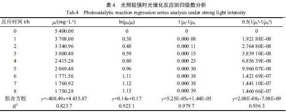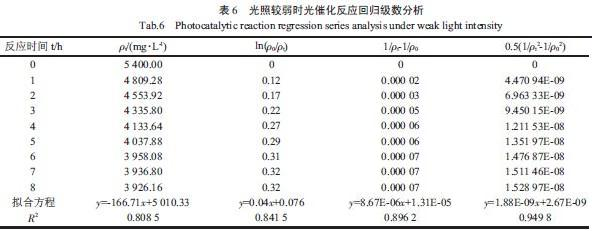 由表4 可知,光照較強條件下,TiO2光催化降解制藥廢水的動力學以二級動力學反應擬合的線性相關性最好,相關系數達到0.979 7,該反應遵從二級反應動力學。由表5 和表6 可知,光照一般條件下,TiO2光催化降解制藥廢水的動力學以三級動力學反應擬合的線性相關性最好,相關系數達到0.969 8,該反應遵從三級反應動力學。隨著光照強度的降低,在光照較弱條件下,TiO2光催化降解制藥廢水的動力學以三級動力學反應來擬合的線性相關性最好,相關系數達到0.949 8,該反應遵從三級反應動力學。綜合比較表4、表5 和表6 可知:光催化降解制藥廢水反應的動力學級數隨光催化反應中光照強度的減弱呈由二級向三級反應升高趨勢。