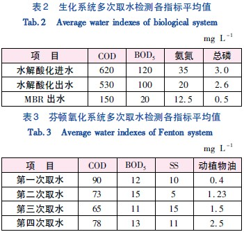 對有機物的去除主要集中在MBR生化系統及高級氧化-芬頓處理系統,因為MBR系統內復合填料的存在,優化了微生物生存條件,提高了污泥濃度,加強了抗沖擊負荷能力,降低了污泥負荷,同時采用MBR出水方式,不僅微生物不會流失,還能截留大分子有機物,增加其停留時間,使有機物降解更徹底; 芬頓處理系統利用Fe2 + 催化氧化氫分解的羥基自由基的強氧化能力,降解不能生物降解的有機成分.具體見表2、3.