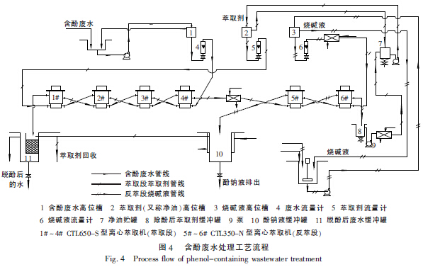 根據(jù)含酚廢水流量,該廢水處理工藝采用3 條處理線,每條線采用4 臺(tái)CTL650-S 型離心萃取機(jī)(1#~4#機(jī))串聯(lián)構(gòu)成4 級(jí)逆流萃取、2 臺(tái)CTL350-N 型離心萃取機(jī)(5#~6#機(jī))串聯(lián)構(gòu)成2 級(jí)逆流反萃工藝。具體工藝流程如圖4 所示。