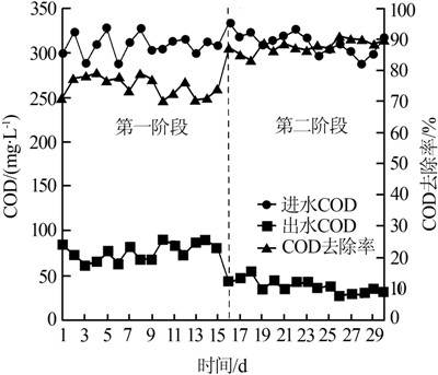 鹽度變化影響微生物生長特性。當反應器中進水鹽度升高時,微生物必須通過調節自身的滲透壓來平衡細胞內的滲透壓或保護細胞內的蛋白質。在筆者實驗中,通過逐步提高進水中海水體積分數對活性污泥進行鹽度馴化,微生物對鹽度的變化具有較長適應時間,因此,鹽度的升高未對反應器的運行造成本質上的傷害,但微生物用于生長繁殖的能量相對減少,這直接影響了微生物對有機物的降解速率,導致COD去除率有所下降。