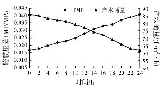 超濾膜運行的跨膜壓差(TMP) 是一個重要指標,它是膜過濾的推動力,跨膜壓差的大小反映出超濾膜的污堵情況[4]。隨著超濾膜截留污染物的不斷增加,超濾膜通量也隨之下降,超濾膜跨膜壓差呈上升趨勢,因此,跨膜壓差也通常用作衡量超濾膜清洗與否的關鍵參數。