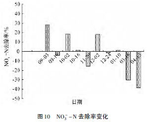 水中NO3--N含量與水中溶解氧含量直接相關,溶解氧高,NH4+-N轉化為NO3--N更充分。由圖9可知: 本工程中收集的農村生活污水ρ(NO3--N) 為3~6 mg/L,平均值為4. 3 mg/L,總體上,NO3--N含量偏高,這主要是污水自厭氧池流出,經三級跌水,使之溶解氧高于一般污水,從而使部分NH4+-N發生硝化反應,轉化為NO3--N。同時,人工濕地不斷交替的好氧和厭氧環境使得NO3--N轉化為氮氧化物和氮氣。因此,在濕地中不斷有NO3--N 的產生和消耗,從而使得NO3--N出現無規則的波動。表明,厭氧反硝化條件不足,甚至出現了去除效率為負值的現象,見圖10。