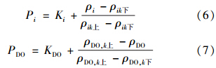 式中,Ki表示第i項水質指標所處的水質類別,可以通過與《地表水環境質量標準》(GB3838—2002)的比較來確定,取值為1,2,…,6;ρi為第i項指標的實測質量濃度,ρik下≤ρi≤ρik上,ρik下為第i項水質指標第Ki類水區間質量濃度的下限值,ρik上為第i項水質指標第Ki類水區間質量濃度的上限值.在《地表水環境質量標準》(GB3838—2002)中列示的水質指標中,只有溶解氧為遞減性指標,其水質標識指數用公式(7)來計算;其余的遞增性水質指標用公式(6)來計算.