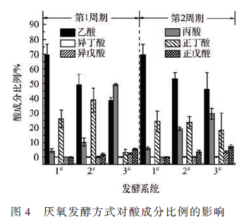 研究發現,微生物是影響SCFAs 成分的主要因素。由圖4 可知,3 個發酵系統中乙酸均為主要成分,與其他學者研究相似 。1#酸化系統中乙酸比例最大分別為69. 55% 和69. 70% (第1、2 個反應周期),3# 發酵系統中乙酸比例最小分別為38. 41%和46. 35% (第1、2 個反應周期),說明乳渣廢水發酵中偏酸條件有利于乙酸積累。同時發現,第2 個反應周期中乙酸積累率大于第1 個反應周期,這是因為同型產乙酸菌是一種嗜低溫微生物,而且醋酸菌對于高溫較敏感,而由圖2(b)可知,第2 個反應周期內溫度明顯低于第1 個反應周期,所以該反應周期內乙酸積累較高。研究發現,在15 ~ 55 ℃ 的污泥堿性發酵過程中乙酸的積累率為40. 7% ~36. 6% ,而本研究發現,乳渣廢水乙酸積累率可達到70% 。因此,乳渣廢水在中性或者酸性條件下厭氧發酵能夠有效的提取乙酸。分析數據可知,與乙酸比例相反,2 個反應周期內3# 發酵系統丙酸積累比例最大分別為49. 27% 和29. 43% ,1#發酵系統中丙酸比例最小分別為4. 19% 和5. 89% 。結果表明,3# 酸化系統中丙酸轉化率較低,導致該系統中乙酸含量最低。研究發現,污泥堿性發酵過程丙酸積累率僅為22. 9% ~ 14. 9% ,而本研究中發現,丙酸積累率可達50% ,說明中性條件下乳渣廢水能夠提取大量的丙酸。2# 發酵系統中正丁酸比例最高為38. 85% ,3# 系統最低約為3. 36% 。3 個發酵系統中異丁酸、異戊酸和正戊酸含量較低幾乎為零。說明乳渣廢水通過水解酸化反應能夠有效促進長鏈酸向短鏈酸轉化。