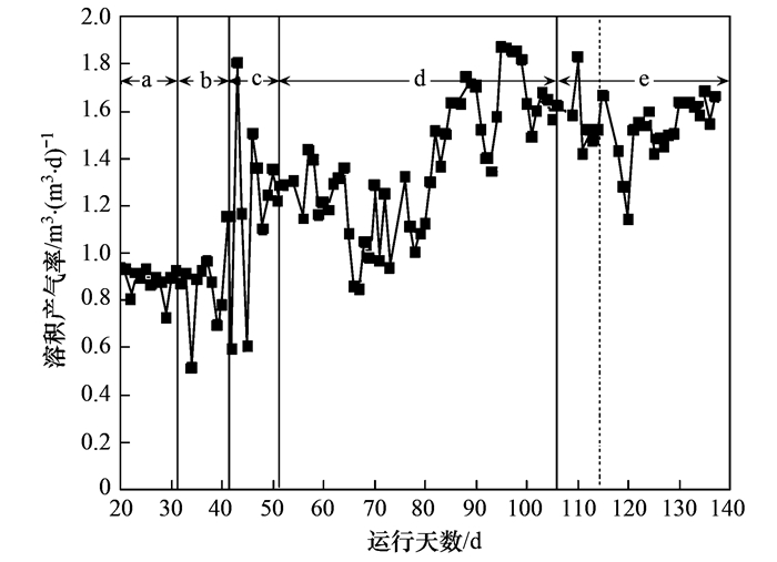 當進水Cl-濃度在7500 mg ·L-1以下時, 反應器的容積產氣率隨鹽度的提升會在出現一定的波動后逐漸提升, 最終穩定維持在一個較高水平.從圖 2可以看出, 在a、b段, 反應器的容積產氣率都比較穩定, 沒有太大變化, 平均為0.91 m3 ·(m3 ·d)-1. 42 d后, 隨著Cl-濃度增大到3500 mg ·L-1, 容積產氣率波動很大, 但整個階段的平均值比前一階段有增長, 為1.19 m3 ·(m3 ·d)-1; 結合同階段COD去除率的變化可見, 與整體的厭氧消化過程相比, 產甲烷過程對鹽度的變化更敏感.當Cl-濃度為5000 mg ·L-1, 反應器的容積產氣率在初期有下降趨勢, 在延長馴化時間并調整進水N、P濃度后, 容積產氣率又逐漸上升, 整個階段的平均值為1.39 m3 ·(m3 ·d)-1; 這個階段的變化趨勢與COD去除率的變化相近.在圖中e段, 反應器的容積產氣率在7500 mg ·L-1的Cl-濃度下略有下降, 經過一段時間馴化后, 反應器的容積產氣率又逐漸回復到原來的水平, 維持在1.63 m3 ·(m3 ·d)-1左右.