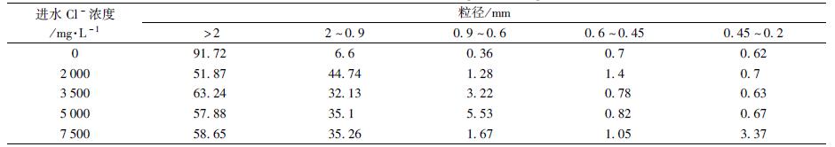 (2) 保持反應器COD容積負荷為3.267kg ·(m3 ·d)-1, 反應器中的厭氧顆粒污泥對于0~7500 mg ·L-1范圍內的Cl-濃度體現出良好的適應性, 大顆粒污泥在鹽度提升的影響下仍然占據反應器顆粒污泥的主體, 而在Cl-濃度短暫提升到10000 mg ·L-1的沖擊下, 粒徑較小的顆粒污泥容易受到影響, 出現解體現象.同等粒徑范圍內厭氧顆粒污泥的沉降性能在高鹽廢水的影響下有小幅度的提升, 并且大顆粒污泥的沉降速度保持在60 m ·h-1以上.