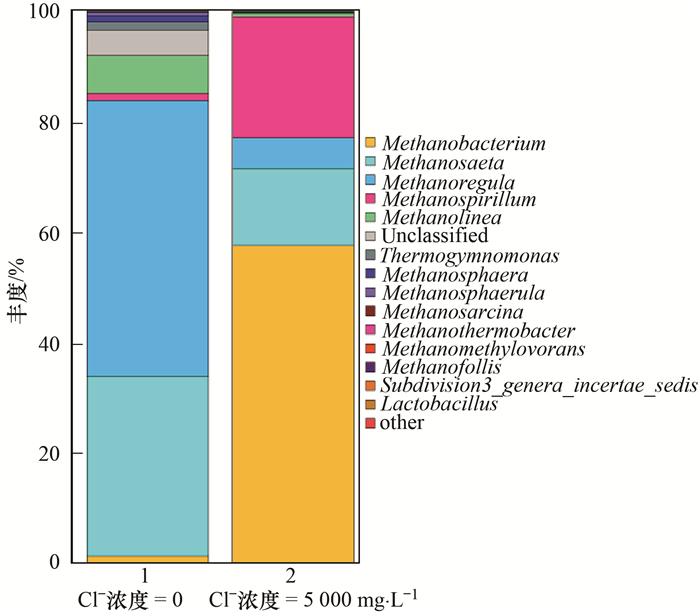 在鹽度的影響下, 微生物群落的優勢菌群變化很大. Cl-濃度為0時, 古菌中的優勢菌屬是Methanoregula與Methanothrix, 分別占總數的50.01%與32.59%, 而當Cl-濃度達到5000 mg ·L-1, 占據優勢的菌屬則是Methanobacterium(57.5%), Methanospirillum(21.9%)和Methanothrix(13.91%). Methanoregula屬于廣古菌門(β-Euryarchaeota)甲烷微菌目(β-Methanomicrobiales), 主要代謝底物是H2、CO2. Methanothrix之前曾用名是Methanosaeta, 屬于專性乙酸營養型產甲烷古菌, 有研究顯示Methanosaeta適于在高負荷下生長. Methanobacterium屬于廣古菌門甲烷桿菌目(β-Methanobacteriales), 可以利用H2、甲酸鹽、甲醇等底物生產甲烷, Methanospirillum屬于廣古菌門甲烷微菌目, 其主要代謝底物為甲酸. Methanoregula, Methanothrix, Methanobacterium, Methanospirillum等都是厭氧消化器中常見的產甲烷菌屬.